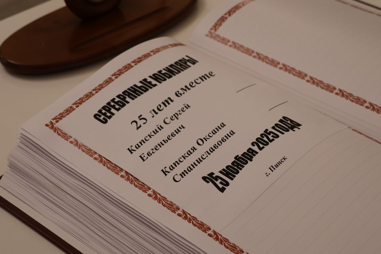 В отделе ЗАГС Пинского горисполкома 25 ноября 2025 года прошло торжественное мероприятие, посвящённое супругам Сергею и Оксане Капским. Пара отметила 25 лет совместной жизни — так называемый «серебряный юбилей».