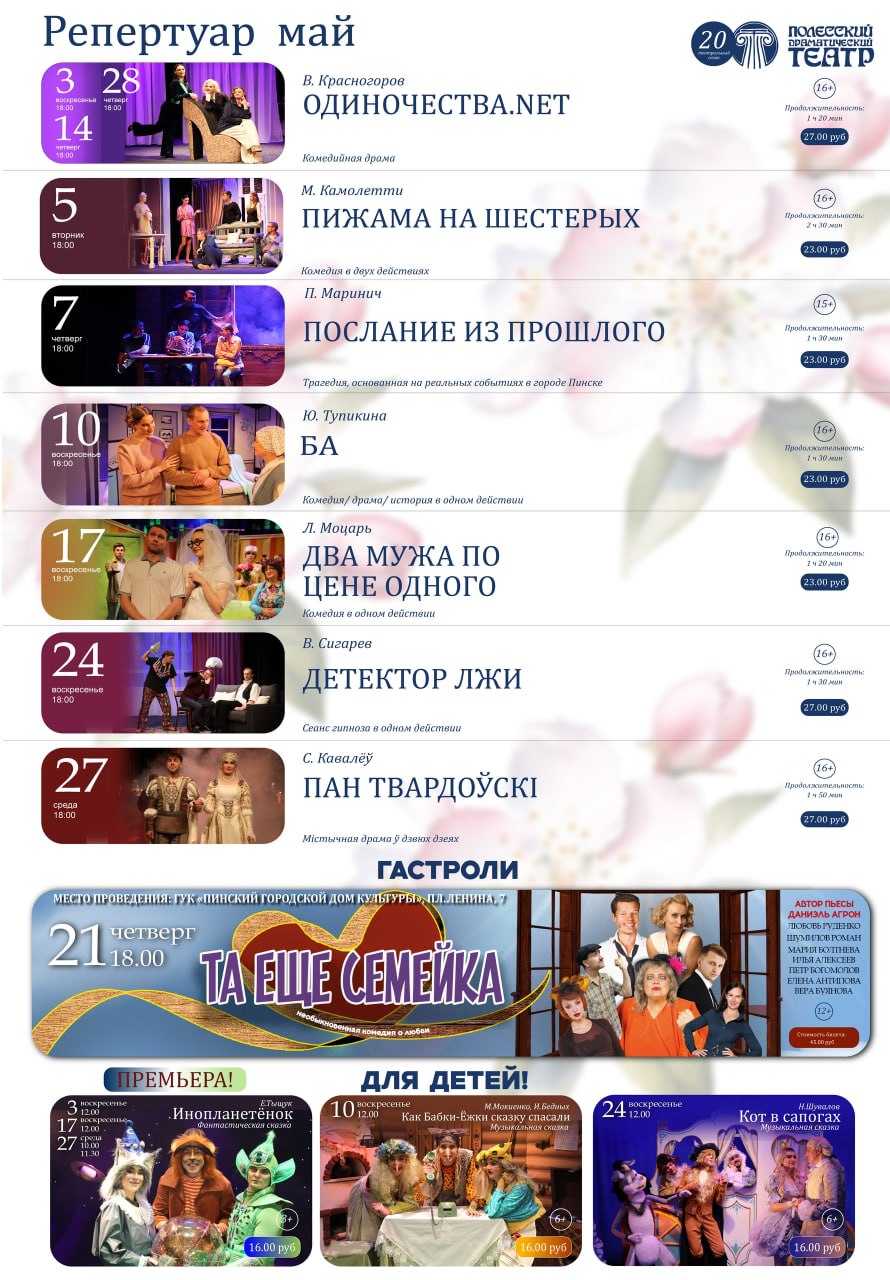 - 7 мая (четверг) в 18:00 - трагедия П. Маринича «Послание из прошлого», основанная на реальных событиях в Пинске.