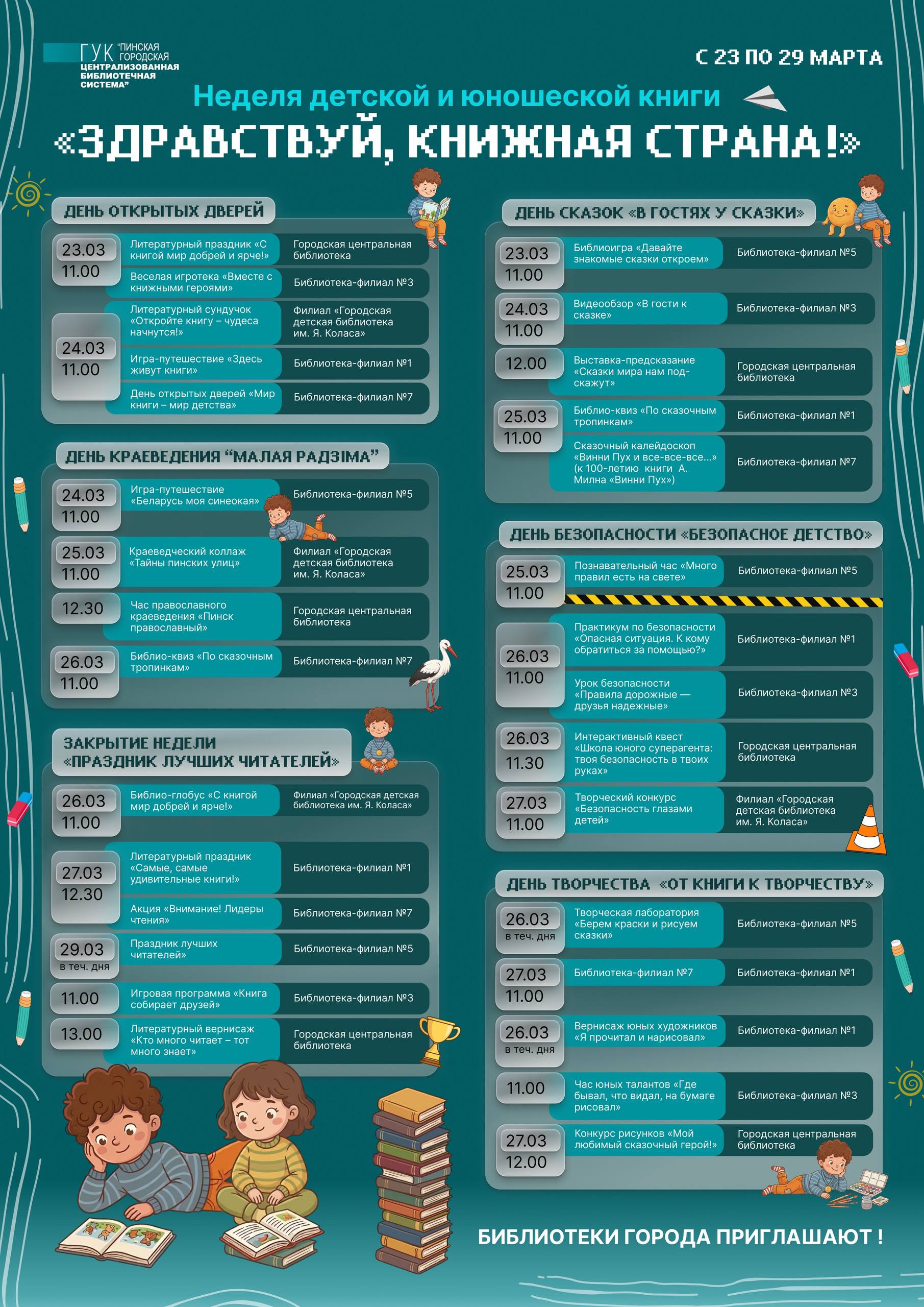 С наступлением весенних каникул библиотекари городских библиотек предлагают своим юным читателям провести каждый день интересно и полезно вместе с книгой. С 23 по 29 марта в Пинске пройдет Неделя детской и юношеской книги «Здравствуй, книжная страна!». Каждый день будет посвящён особой тематике, объединяющей познавательные мероприятия, веселые игры и занимательные конкурсы.