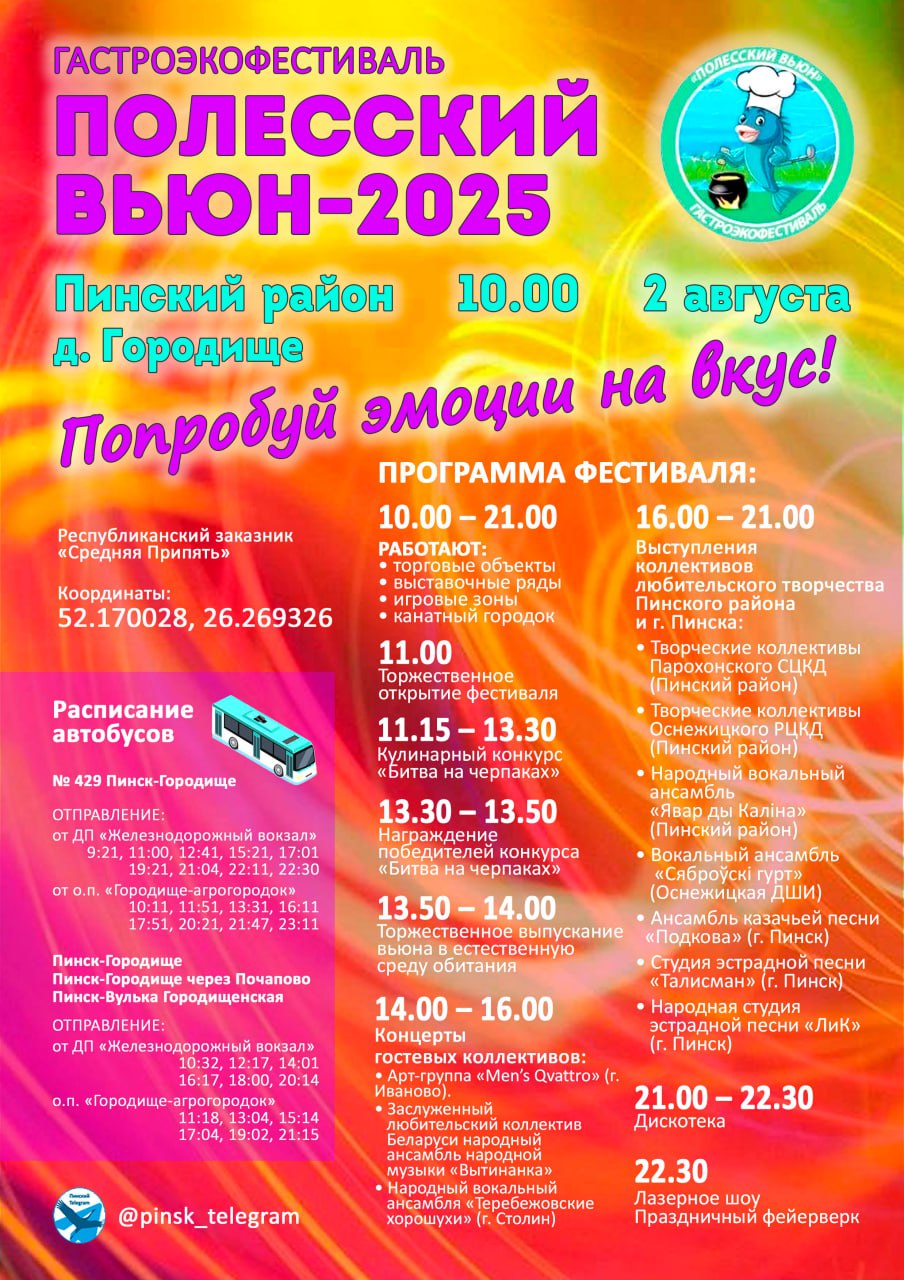 2 августа в деревне Городище Пинского района состоится гастроэкофестиваль «Полесский вьюн-2025». Мероприятие пройдёт на территории республиканского заказника «Средняя Припять» и объединит гастрономию, экологические инициативы и культурные активности.
