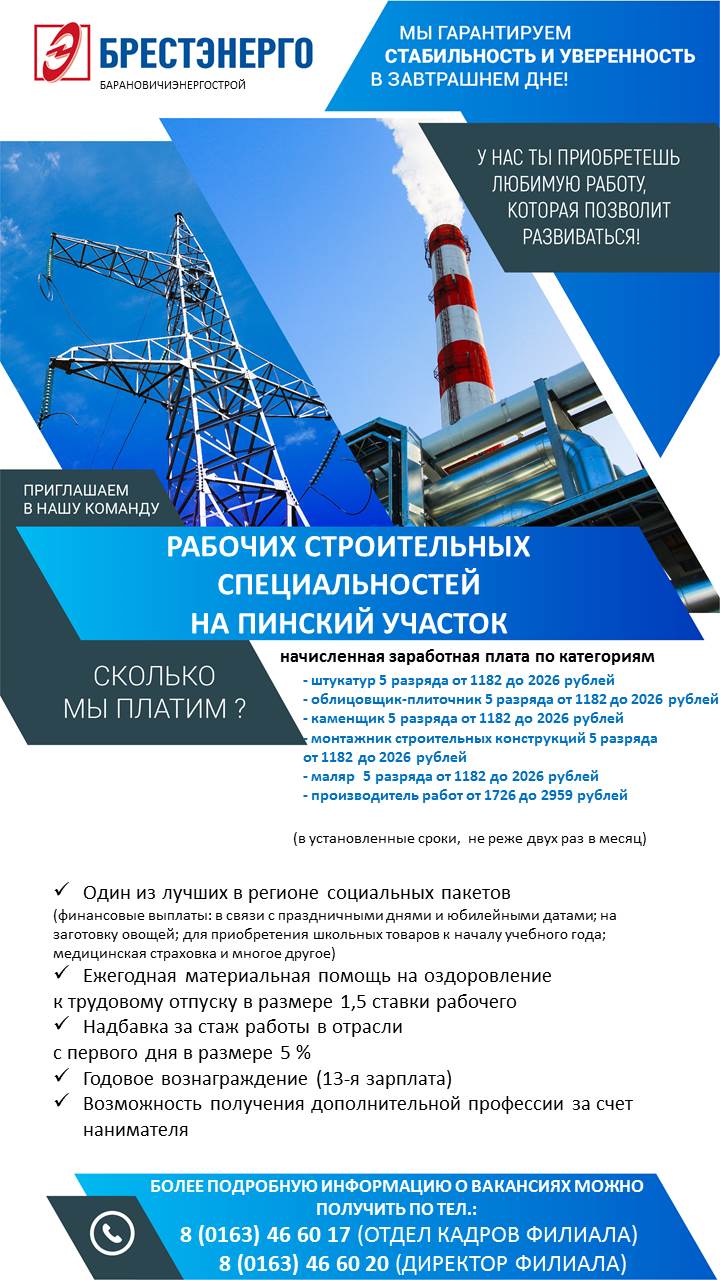 БРЕСТЭНЕРГО сообщает о наличии открытых вакансий на рабочие строительные специальности в Пинском участке. Организация гарантирует стабильность и уверенность в завтрашнем дне, предлагая своим сотрудникам возможность развиваться в любимой профессии.