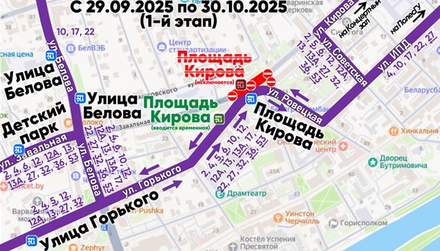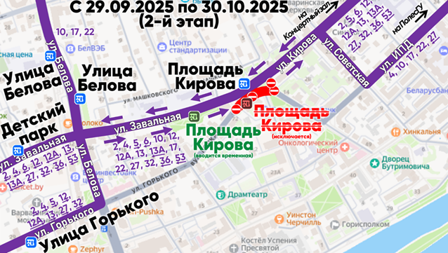 Движение автобусов городских регулярных маршрутов №№ 2, 4, 5, 6, 10, 12, 12А, 13, 13А, 17, 22, 27, 32, 36, 53 и пригородных регулярных маршрутов будет осуществляться по ул. Горького и ул. Ровецкой в обоих направлениях. Остановочный пункт «Площадь Кирова» в направлении ул. Белова временно переносится на ул. Горького.