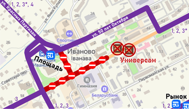 Автобусы городских маршрутов №№ 1, 2, 3 вместо движения по ул. Советской будут следовать по ул. 50 лет Октября. Исключаются из обслуживания остановочные пункты «Универсам» в обоих направлениях.