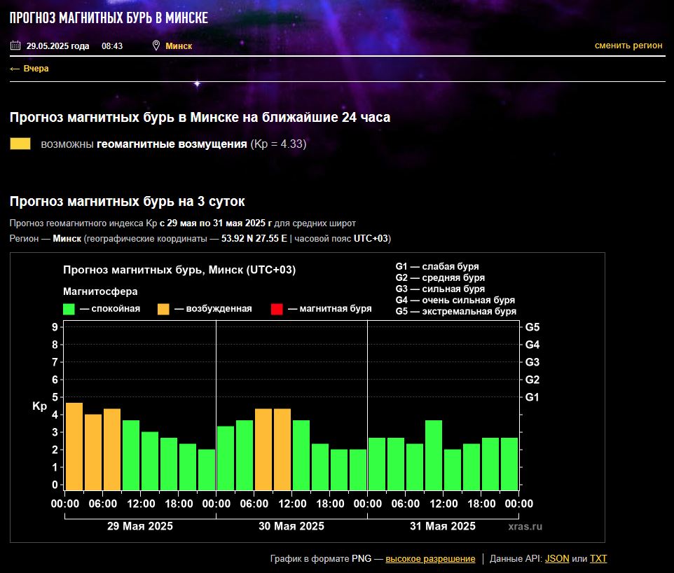 По прогнозу Лаборатории солнечной астрономии и гелиофизического приборостроения (ИКИ РАН и ИСЗФ СО РАН), в ближайшие сутки интенсивность магнитного возмущения в Минске составит Kp = 4.33.