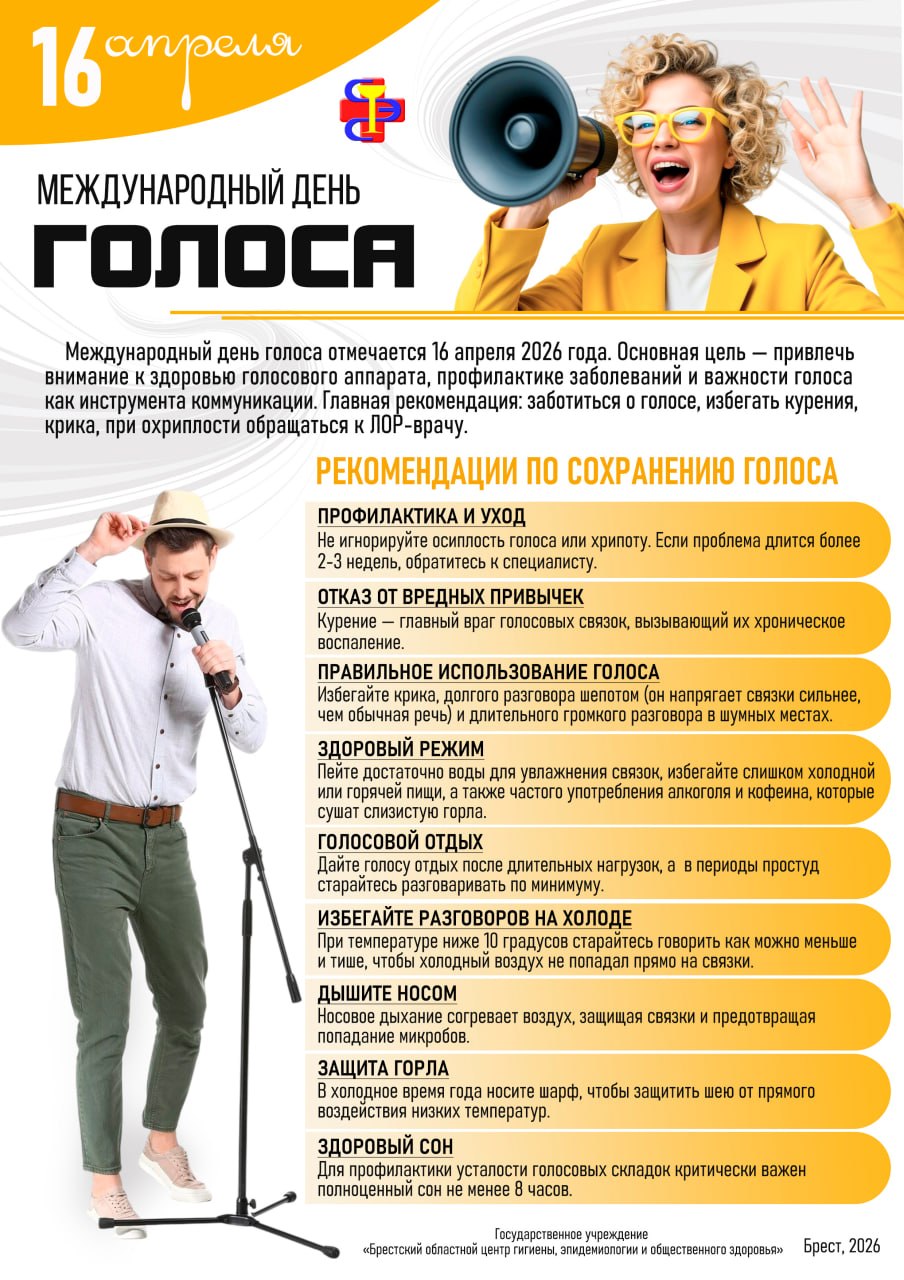 Международный день голоса отмечается 16 апреля. Пинский зональный центр гигиены проведет горячую линию по вопросам профилактики заболеваний и важности голоса в рамках проекта «Здоровый город» на территории города Пинска.