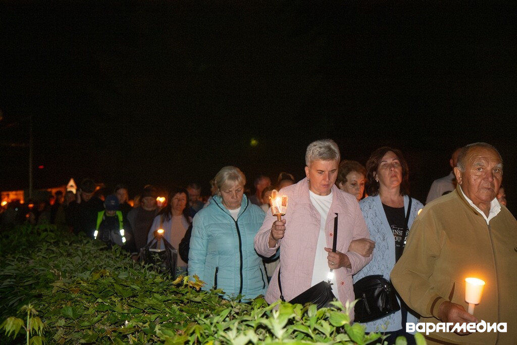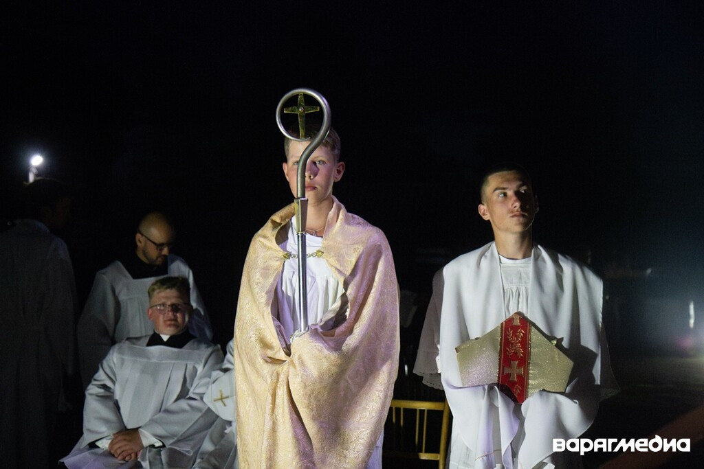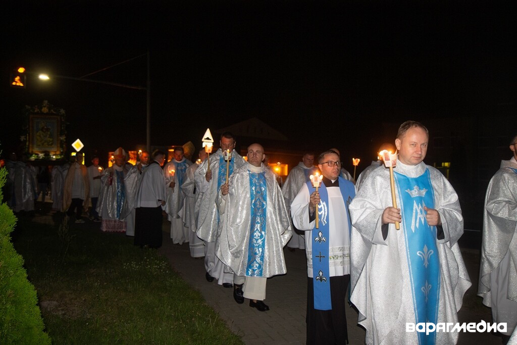 Пасля невялікага адпачынку і вячэры ўсе пілігрымы сабраліся на вечаровай святой Імшы перад касцёлам святых Апосталаў Пятра і Паўла ў Лагішыне. А затым адбылася начная працэсія са свечкамі вакол касцёла.