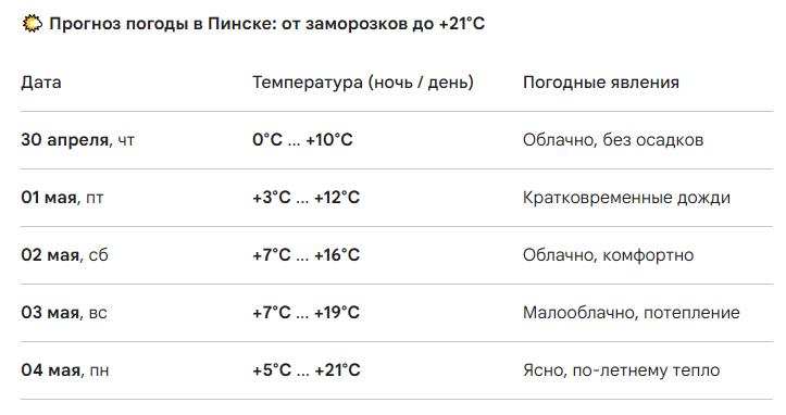 Днем 29 апреля погода сохраняет неустойчивый характер. Несмотря на яркое солнце, воздух в Пинске прогревается крайне неохотно – максимум до +6... +10°C. Северо-западный ветер продолжает приносить прохладу, а в отдельных частях района фиксируются кратковременные осадки, местами переходящие в снежную крупу.