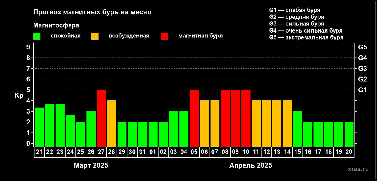 К концу месяца ожидается увеличение геомагнитной активности, с прогнозом магнитной бури уровня G1, которая продлится с 27 по 28 марта.