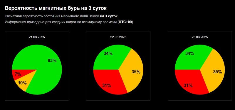 Что касается магнитных бурь, то до конца недели магнитосфера Земли будет находиться в относительно спокойном состоянии, хотя ученые не исключают вероятность их возникновения. Оценка рисков на ближайшие дни такова: на 22 марта — 31%, на 23 марта — 31%.