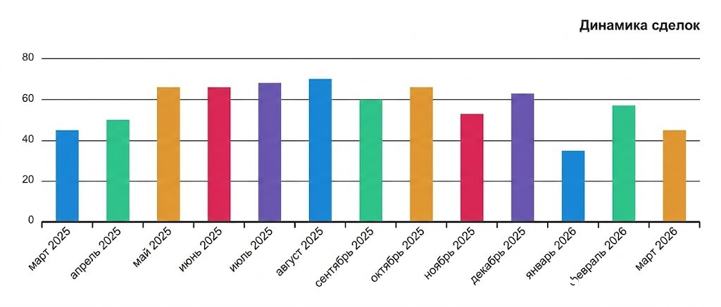 На данный момент в базе Национального кадастрового агентства зафиксировано 45 договоров купли-продажи. С учетом задержки регистрации данных эксперты прогнозируют итоговое количество в районе 48 сделок. Это средний показатель для города: в прошлом марте результат был аналогичным, а вот по сравнению с февралем 2026 года активность покупателей снизилась (тогда было продано 57 квартир). Сделок с готовыми новостройками в марте зарегистрировано не было.