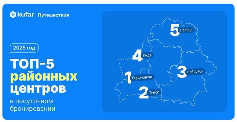Среди райцентров Пинск оказался в числе наиболее востребованных направлений. Город над Пиной занял вторую строчку в топ-5 городов по количеству бронирований наряду с Барановичами, Бобруйском, Лидой и Полоцком. Такой результат подтверждает, что город становится привлекательным для туристов и командированных, выбирающих удобный формат проживания — квартиры на сутки.