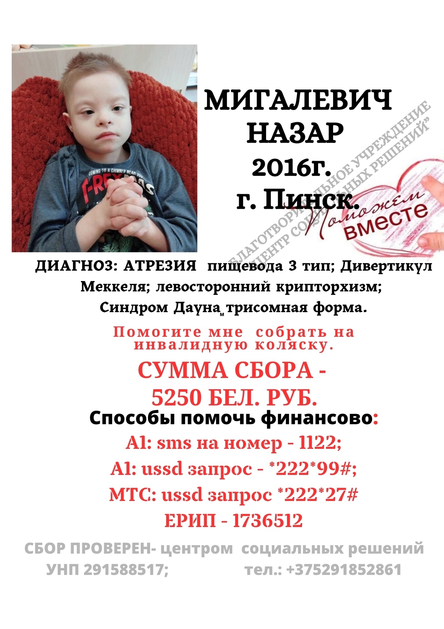 Работники благотворительного учреждения «Центр социальных решений» информируют о необходимости помощи для Назара Мигалевича, 2016 года рождения, который проживает в Пинске. У мальчика есть серьезные медицинские проблемы, включая атрезию пищевода третьего типа, дивертикул Меккеля, дефекты межпредсердной и межжелудочковой перегородок, левосторонний крипторхизм, синдром Дауна трисомной формы, а также значительная задержка в психомоторном и физическом развитии.