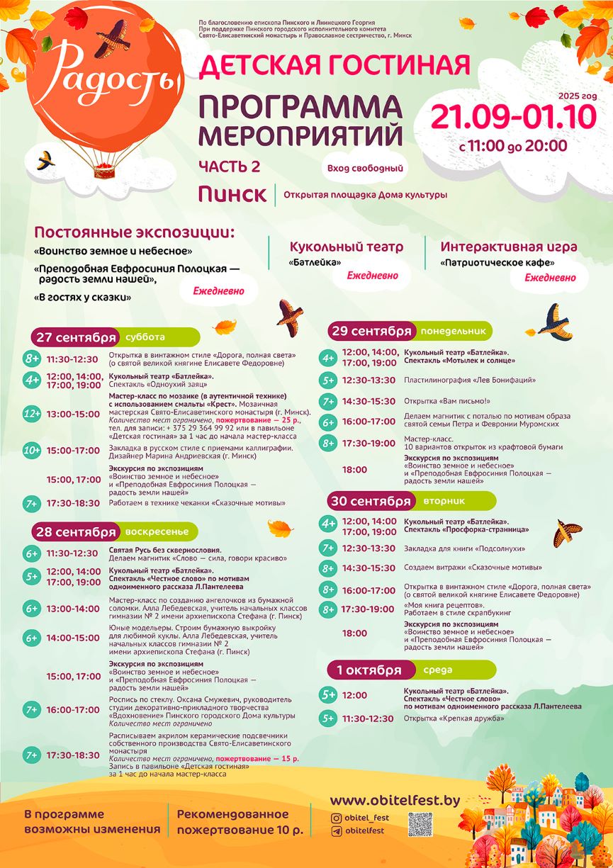 - Детская зона: кукольный театр «Батлейка», мастер-классы, скрипторий.