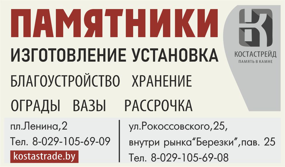 Частное предприятие «КостасТрейд» является одним из ведущих производителей памятников в Пинске и работает более 14 лет. Компания предлагает широкий выбор памятников, оград и аксессуаров, а также услуги по благоустройству мест захоронения в Пинске, Столине, Лунинце, Иваново и ближайших районах. Используя качественные материалы от проверенных поставщиков из Беларуси, России и стран ближнего зарубежья, «КостасТрейд» обеспечивает высокое качество на всех этапах — от изготовления до установки.