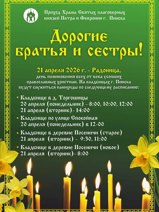 Расписание панихид на Радоницу на кладбищах Пинска 20-21 апреля