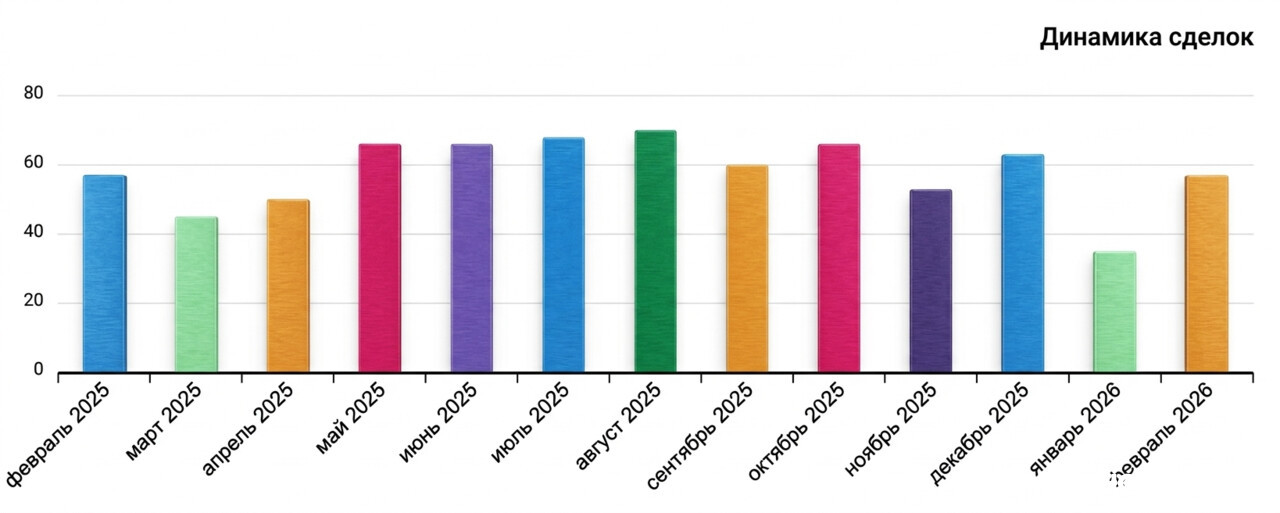 Сравнение с февралем 2025 года показывает любопытную деталь: количество покупателей осталось практически идентичным (57 сделок тогда и сейчас). Однако «качество» этих сделок изменилось – цены за год совершили заметный рывок вверх.