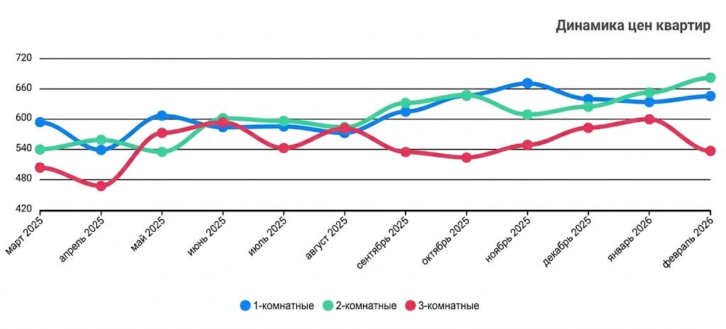 - 3-комнатные: главная аномалия февраля. Цена метра рухнула до 537$ (минус 63$ за месяц). Это падение сделало просторное жилье привлекательнее, что сразу отразилось на статистике: доля «трешек» в структуре продаж выросла до 28%.
