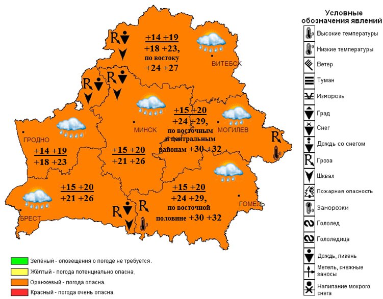 Белгидромет объявил оранжевый уровень опасности на 9 июля в связи с приближением циклона «Габриэль». По прогнозам синоптиков, в Пинске и Пинском районе ожидаются сильные дожди, грозы, шквалистый ветер до 15–20 м/с, местами — град. На западе страны за сутки может выпасть более 50 мм осадков.