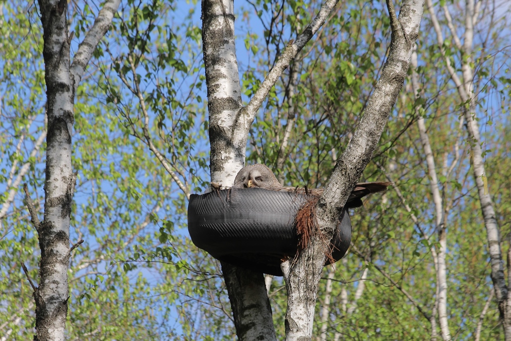 Чтобы неясыти не оставались «без квартиры», сотрудники заказника делают искусственные гнездовья. Раньше – деревянные. Сейчас – из старых автопокрышек. Их выворачивают, обрабатывают, закрепляют на высоте. Получается надёжно, долговечно и экологично.