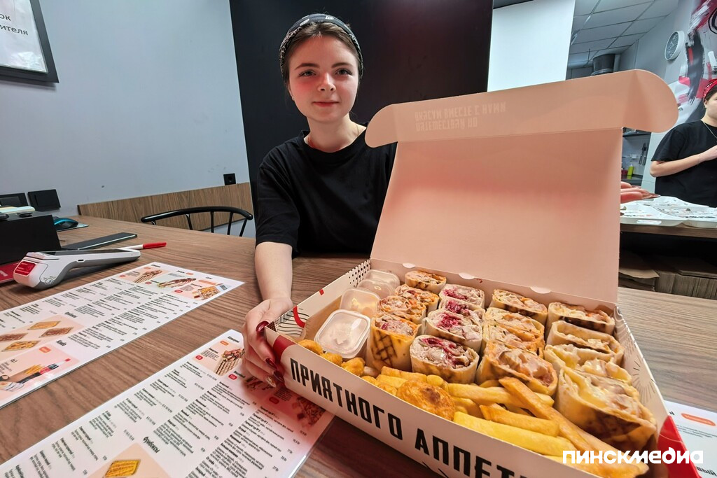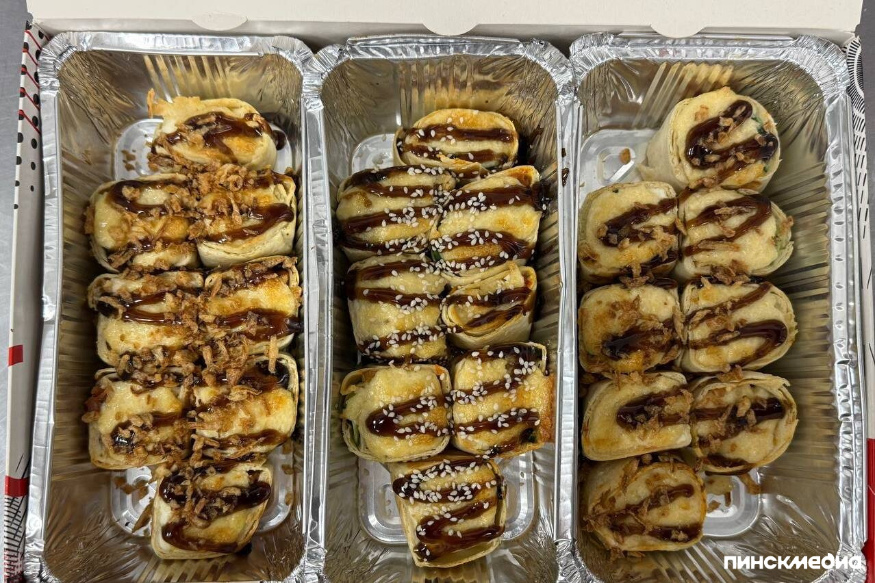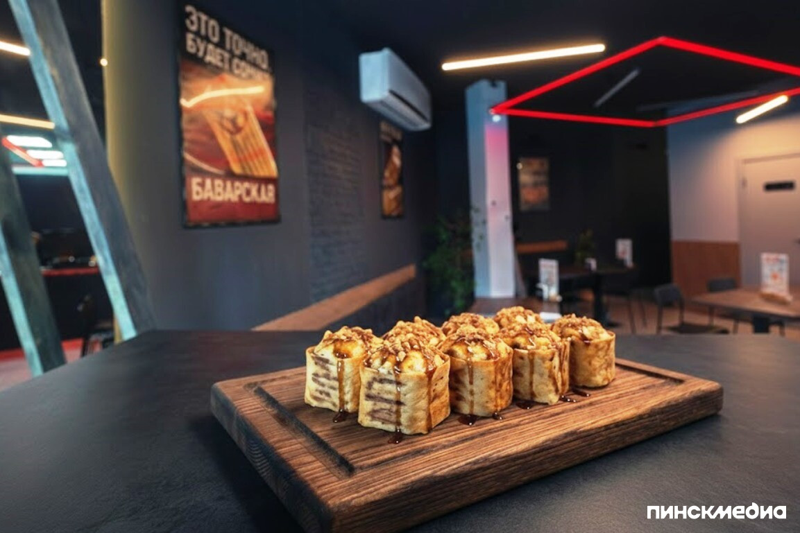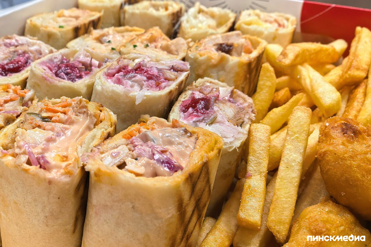 Главный хит, который мы рекомендуем протестировать – запеченные гриль-роллы. Это абсолютно новый формат для Пинска: привычную шаверму нарезают на восемь порционных кусочков и запекают под плотными, тягучими сырными «шапочками».